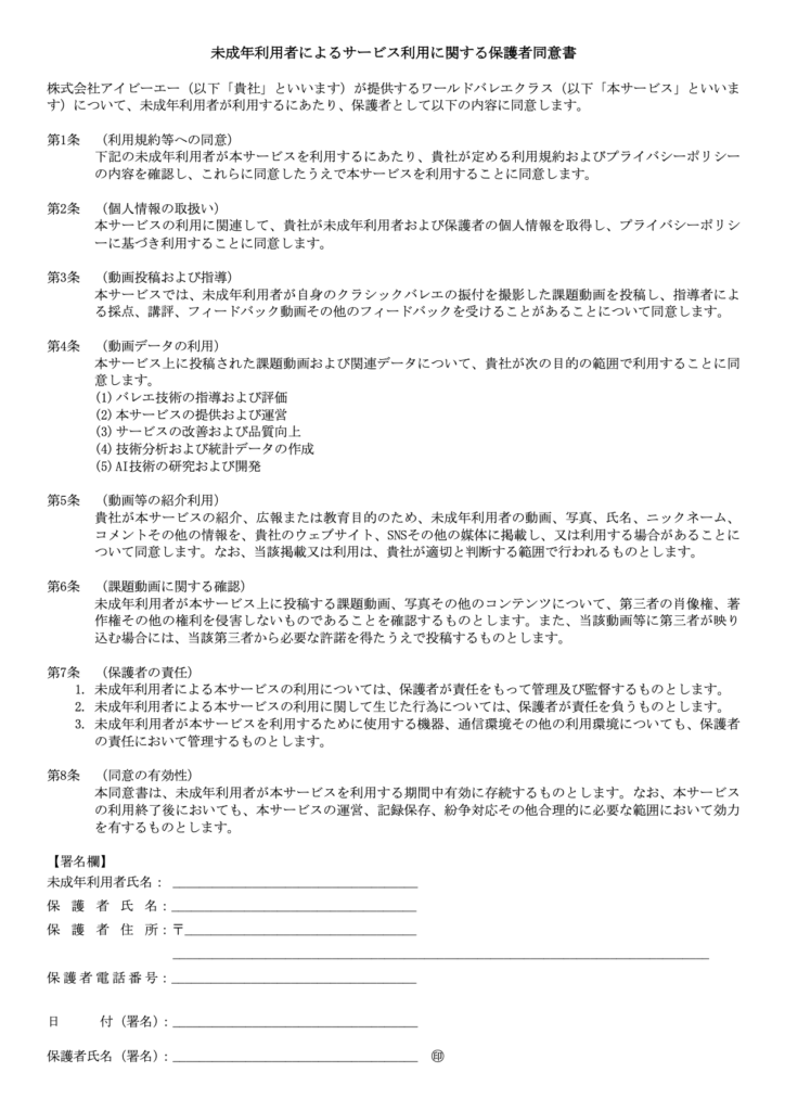 未成年利用者によるサービス利用に関する保護者同意書